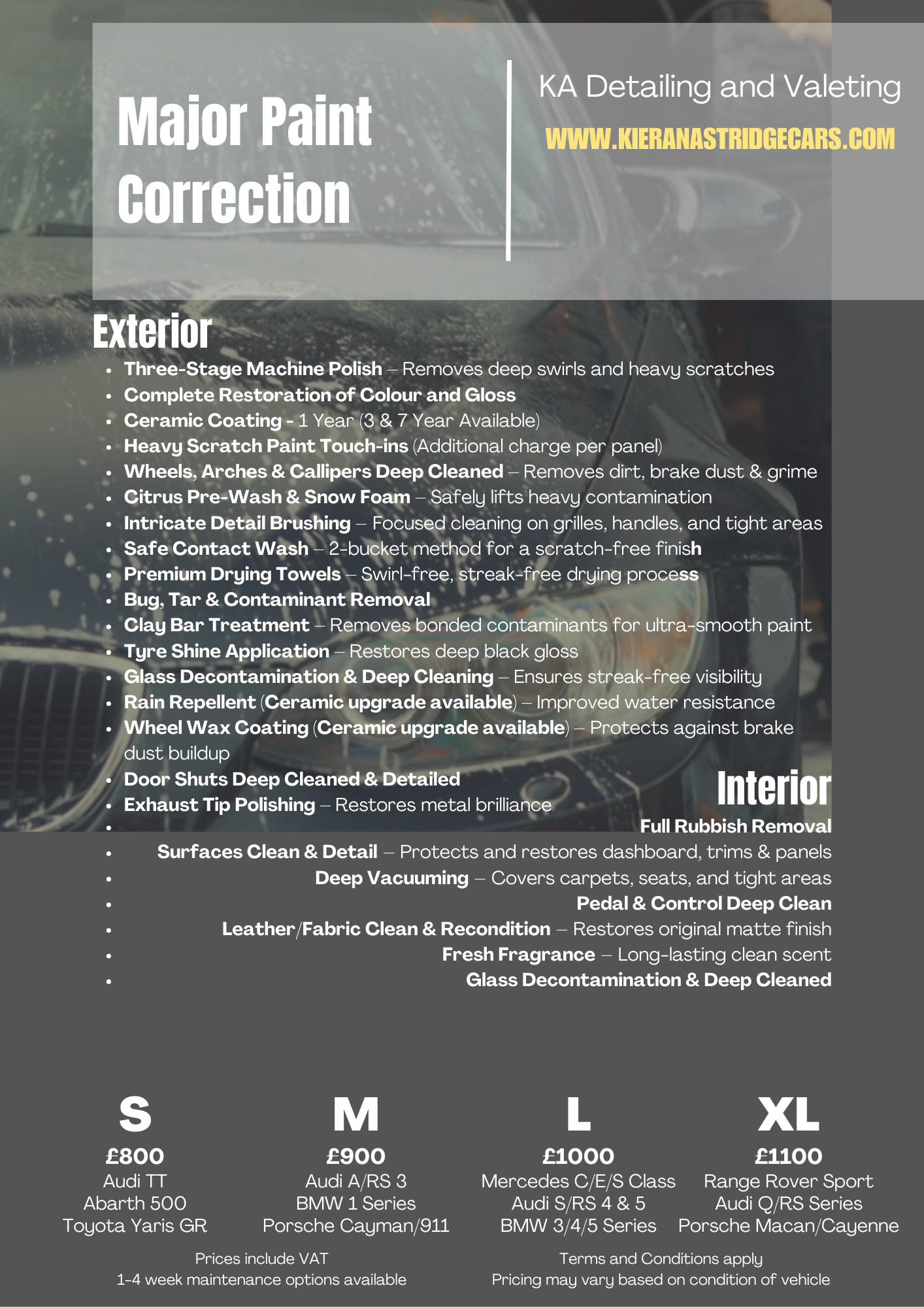 Wheel wax coating (ceramic upgrade available) – protects against brake dust buildup