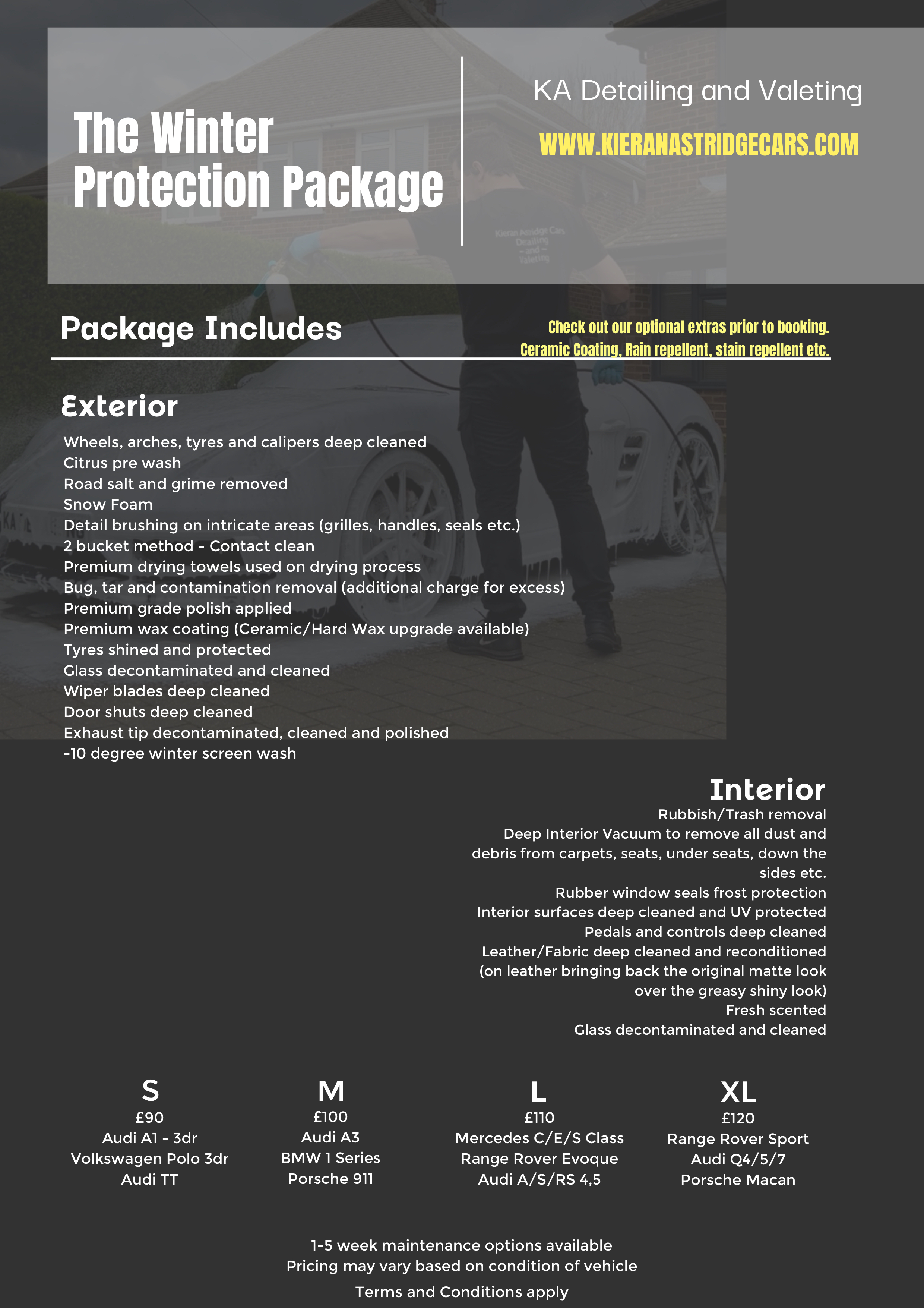 Shield your vehicle from harsh winter conditions with comprehensive protection against road salt, grime, and moisture. Premium wax coating protects paintwork (ceramic upgrade available), while specialised treatments safeguard glass and rubber seals from frost damage. Deep cleaning removes corrosive winter contaminants, and -10 degree screen wash ensures clear visibility in freezing conditions. Everything your car needs to survive and thrive through winter.